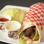 CA$7.991 Skewer of BBQ ground beef marinated with garlic and special hot spices rolled with garlic sauce, fresh vegetables, pickles[...]