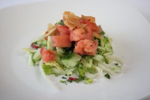 A mix of freshly cut vegetables dressed with lemon juice, olive oil and herbs served with crunchy fried pita.