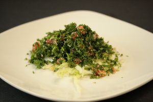 Tabouli CA$5.99 Description Crushed wheat, mixed with parsley, tomatoes, green onions, and dressed with lemon juice, and olive oil